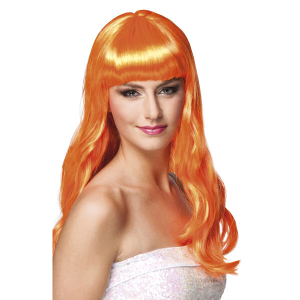 Oranje pruik Chique met pony en lang oranje. Mooie oranje pruik met lang haar en een pony. Deze pruik is het perfecte accessoire om je looks te transformeren voor speciale gelegenheden zoals Koningsdag, het EK/WK of andere oranje feesten.