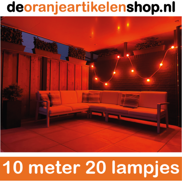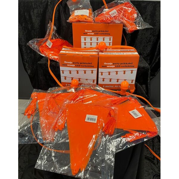 | Inhoud | 2x Oranje lichtsnoer 5 meter (koppelbaar) - 1x Oranje lichtsnoer 10 meter (koppelbaar) - 5x Oranje puntvlaggenlijn 10 meter - 2x Oranje vlaggenlijn 40 meter - 1x 50 Oranje ballonnen |