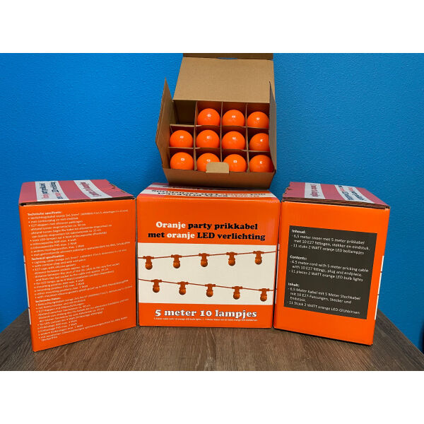 Het compacte oranje lichtsnoer van 5 meter met 10 LED bollampjes is de perfecte keuze voor kleinere ruimtes zoals balkons, kleine terrassen, camperbezitters en gezellige hoekjes. Dit professionele lichtsnoer is volledig oranje uitgevoerd - van kabel tot fitting en lampje - en dankzij de IP65 waterdichte fittingen geschikt voor intensief buitengebruik. Ideaal voor Koningsdag, EK, WK en andere oranje festiviteiten.