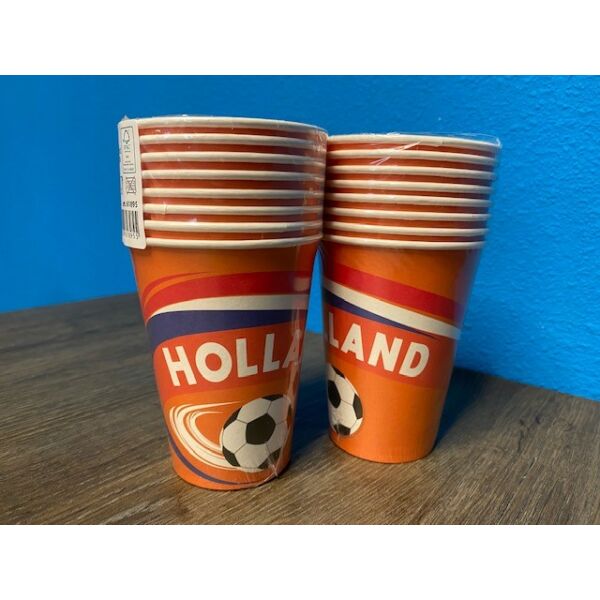 Set 8 papieren oranje bekertjes 'Holland' (21 cl). Het drankje smaakt extra lekker in deze leuke papieren Holland bekers. Het vrolijke voetbal design maken ze perfect voor een gezellig feestje tijdens het WK of EK. Verpakking: in plastic.