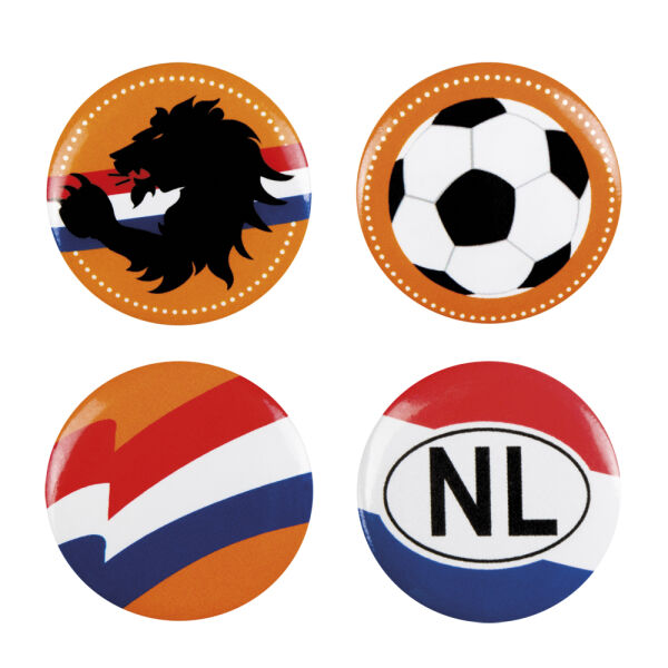 Set van 4 Buttons Holland. De gadget die elke oranje Holland Fan moet hebben Afmeting Ø 30 mm Levering per set. UNIEK IN DEORANJEARTIKELENSHOP