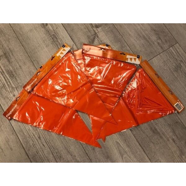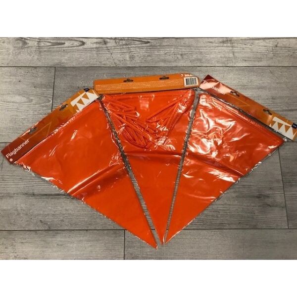 Oranje Vlaggenlijn 10 meter met 15 XL puntvlaggen. Mooie vlaggenlijn oranje 10 meter met 15 XL puntvlaggen. Deze slinger is 10 meter lang en gemaakt van plastic. Afmeting puntvlaggen ca 27 x 43 cm (B x H). De vlaggenlijn is niet brandvertragend. Lengte : 10 meter. Kleur: Oranje. Materiaal : Plastic. Aantal puntvlaggen : 15